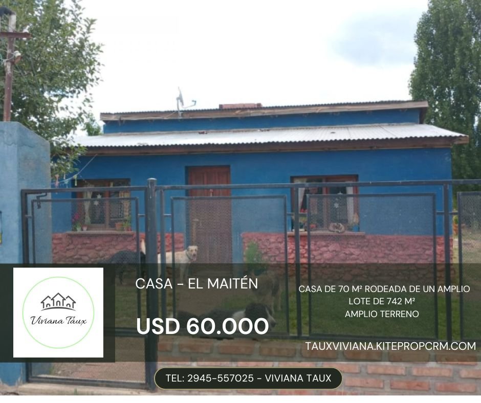 🌟 ¡Descubrí tu rincón soñado en la Patagonia! 🌟 Te presentamos una oportunidad única: una encantadora casa de 70 m² rodeada de un amplio lote de 742 m² en El Maitén, Chubut. Esta propiedad se encuentra en una ubicación privilegiada, a solo 60 km de El Bolsón y rodeada de majestuosos paisajes de montaña. 🌄 La casa, construida hace 40 años y en excelente estado, ofrece comodidad y funcionalidad. Consta de una cocina, un comedor/sala de estar, dos dormitorios acogedores y un baño, complementado con un práctico lavadero. 🏠✨ Sumate a la tranquilidad y belleza de un entorno natural incomparable: ríos, arroyos y cascadas están al alcance de la mano, junto a la hermosa playa de El Maitén, ideal para disfrutar de los días soleados. 🌊🌲 Además, el terreno ofrece un enorme potencial de desarrollo, adecuado para proyectos residenciales o comerciales. Aprovechá la creciente infraestructura de la zona para asegurar tu inversión a futuro. 📈🌟 Esta es la oportunidad imperdible para aquellos que buscan paz y naturaleza en la Patagonia, ideal para convertirse en tu hogar familiar o en un destino turístico excepcional. ¡No dejes pasar esta experiencia única! 🏡❤️