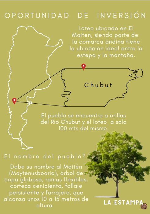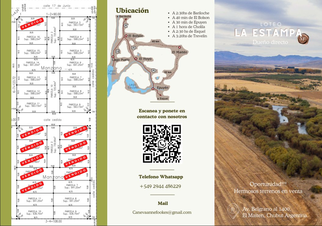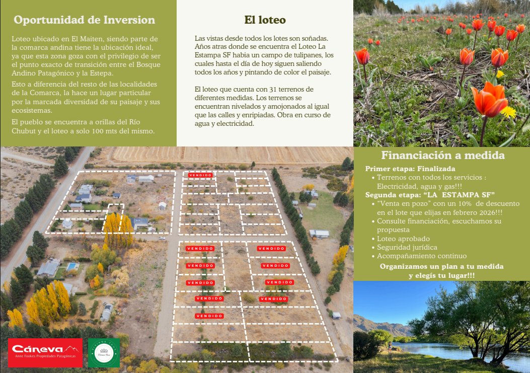 ¡Increíble! 😊 El Loteo La Estampa SF en El Maitén es un proyecto soñado, con vistas impresionantes y un entorno natural único. Los campos de tulipanes que florecen cada año son un toque mágico. - 31 terrenos de diferentes medidas, nivelados y amojonados - Calles enripiadas y servicios de agua, electricidad y gas - Financiación a medida y acompañamiento continuo - Oferta especial: 10% de descuento en febrero 2026 ¿Te gustaría saber más sobre los terrenos o la financiación? ¿Necesitas ayuda para elegir el lote perfecto? 🏞️
